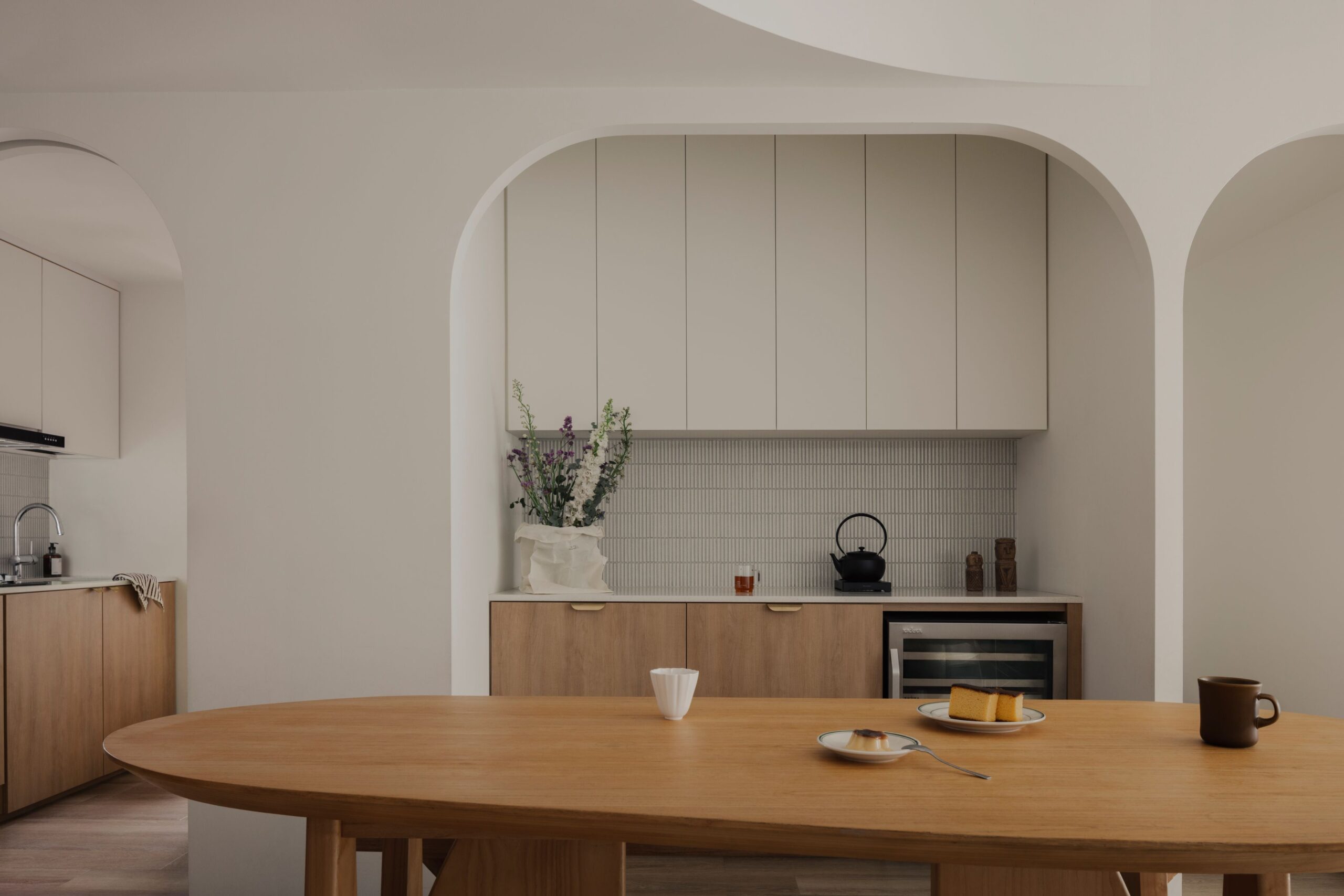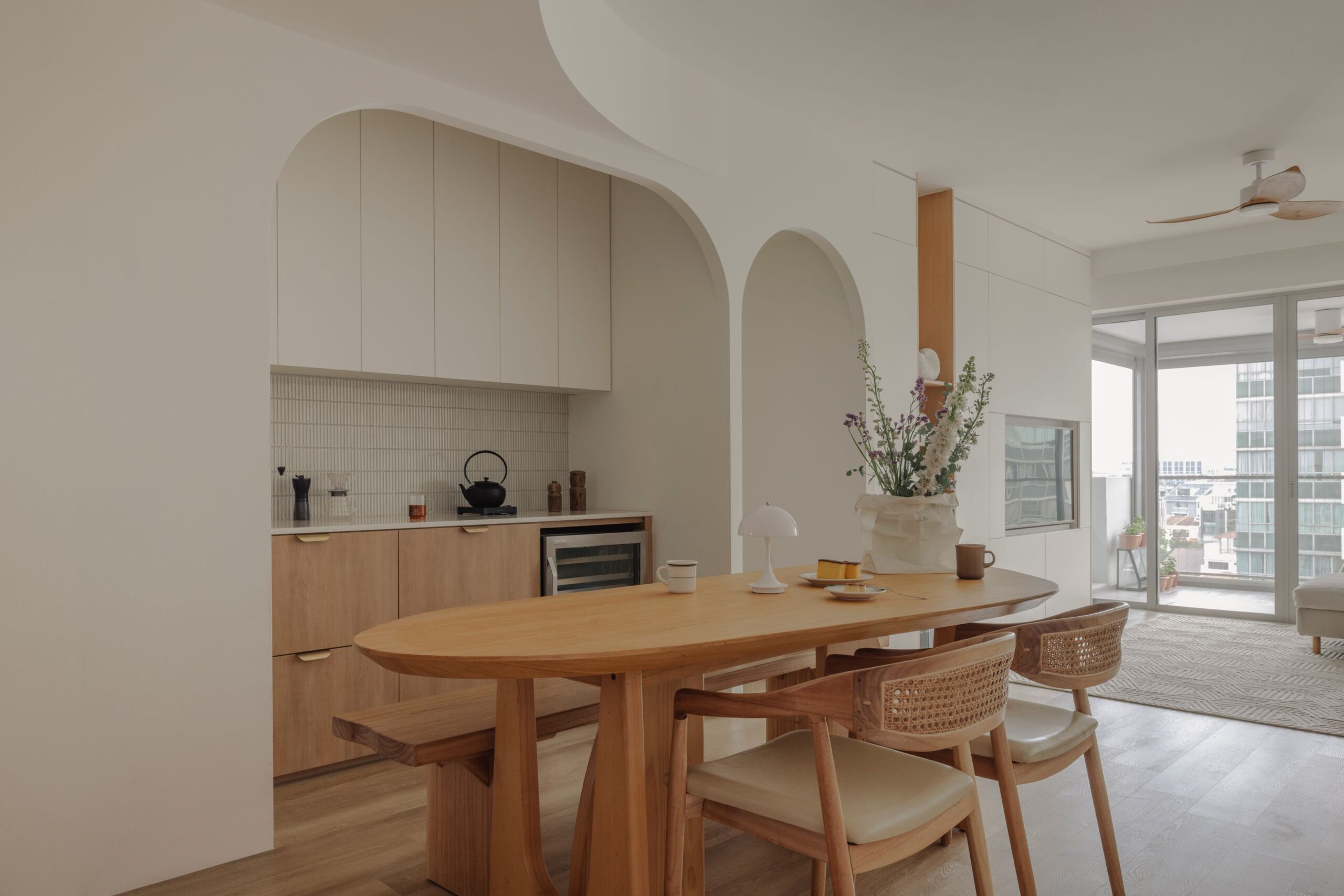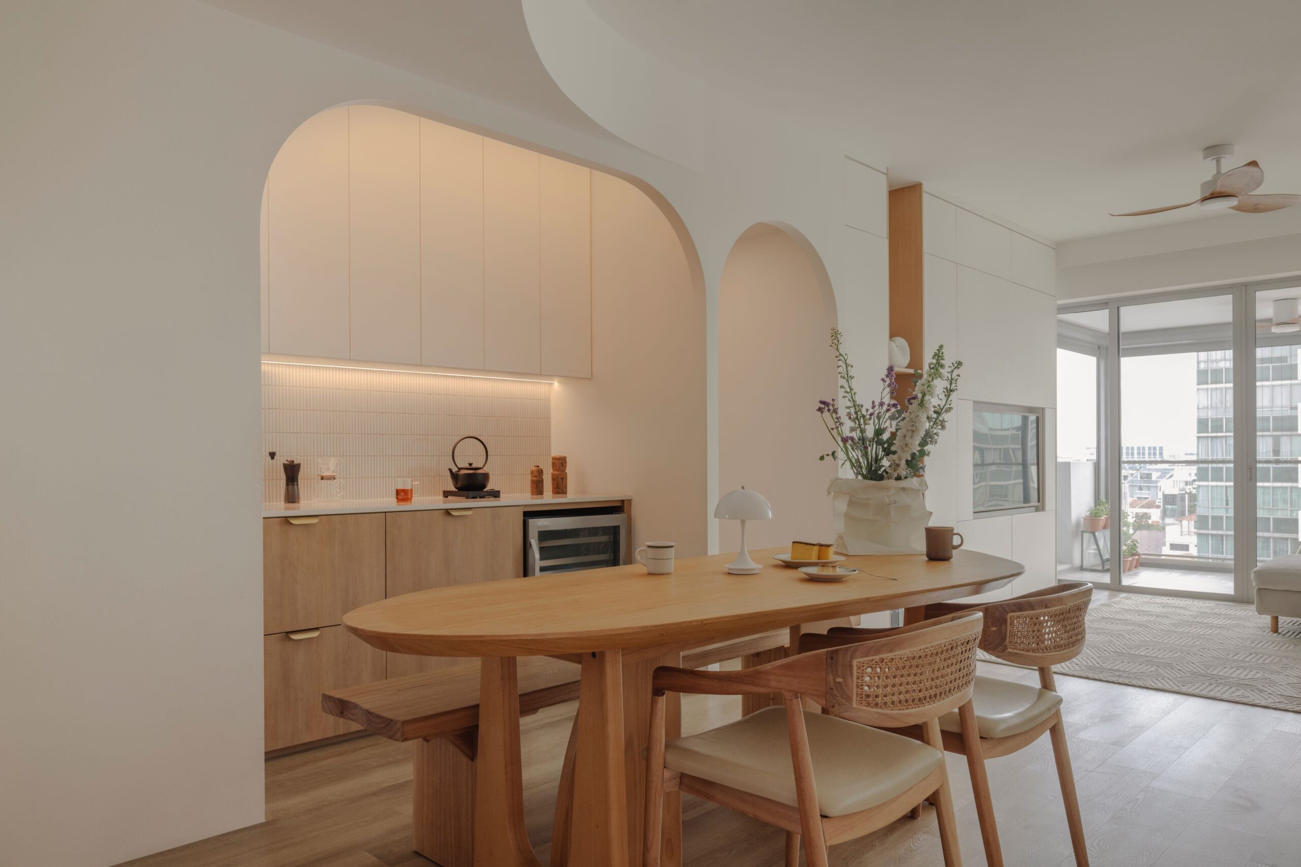 Sun-drenched corners and the soft rhythm of arches define this sanctuary, where sharp lines give way to gentle curves and cool whites are grounded by the organic warmth of birch wood.